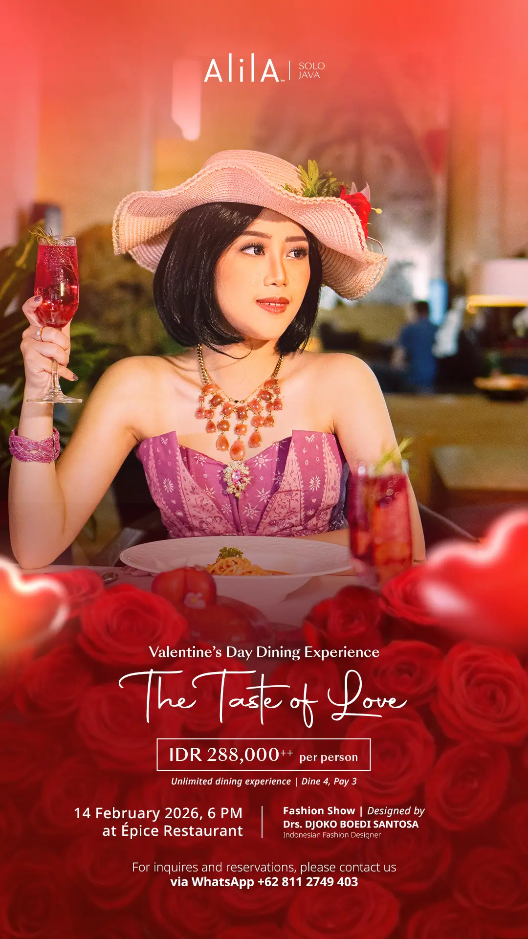 Perayaan dimulai pada 14 Februari dengan santap malam di hari kasih sayang atau Valentine’s Day bertajuk “The Taste of Love” di Épice Restaurant dengan harga IDR 288.000++ per orang. Mulai pukul 18:00 WIB, para tamu dapat menikmati pengalaman makan malam sepuasnya dari meja-meja buffet Épice Restaurant yang berlangsung dengan suasana yang romantis, diperkaya dengan peragaan busana karya Drs. Djoko Boedi Santosa yang menambah sentuhan artistik sepanjang malam. Tesa Pujiastuti, Event Manager Alila Solo menjelaskan, “Konsep Valentine tahun ini dibuat lebih intim namun tetap meriah, dengan ragam hidangan dan sentuhan fashion yang memperindah suasana.”