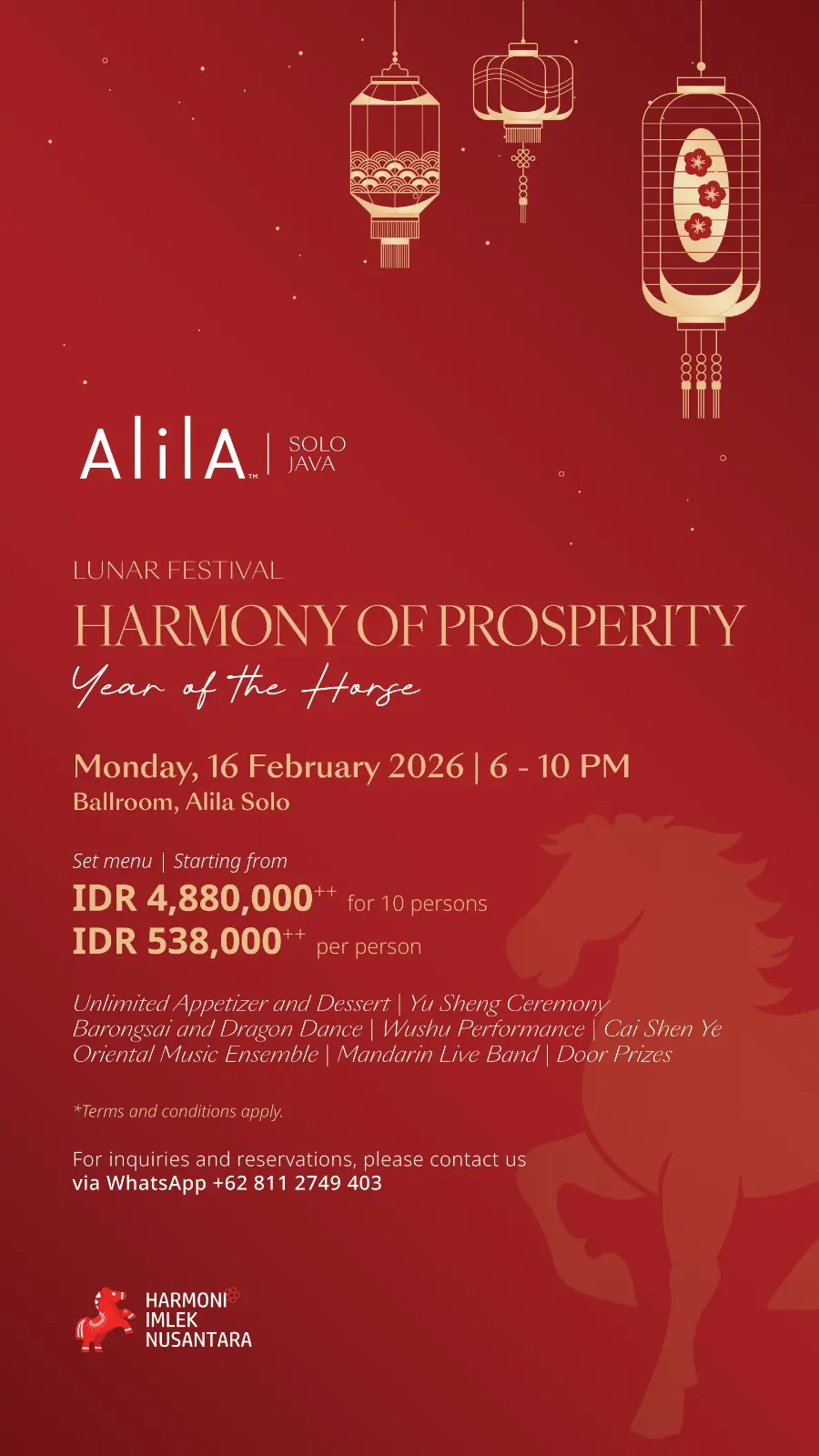 Memasuki perayaan Imlek, Alila Solo akan menggelar acara bertajuk “Harmony of Prosperity” pada hari Senin, 16 Februari 2026 di Grand Ballroom, Alila Solo. Acara yang berlangsung mulai dari 18:00 WIB ini menyajikan serangkaian hiburan khas seperti Yu Sheng Ceremony, pertunjukan barongsai dan tarian naga, aksi pertunjukan wushu, kehadiran Cai Shen Ye, musik ansambel tradisional khas Tiongkok, hingga live band berbahasa Mandarin, serta dimeriahkan dengan door prizes.