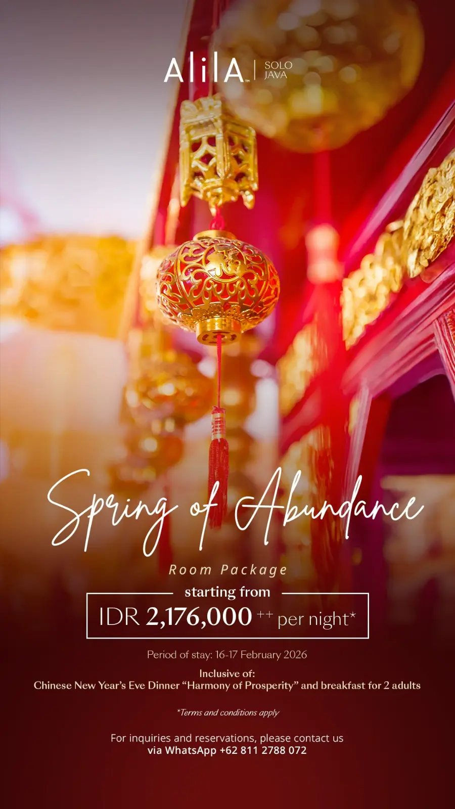 Untuk tamu yang ingin melengkapi perayaan Imlek dengan pengalaman menginap, Alila Solo menawarkan paket kamar “Spring of Abundance” pada 16–17 Februari 2026. Dengan harga mulai dari IDR 2.176.000++ per malam, tamu sudah mendapatkan makan malam “Harmony of Prosperity” di Grand Ballroom serta sarapan untuk dua orang.