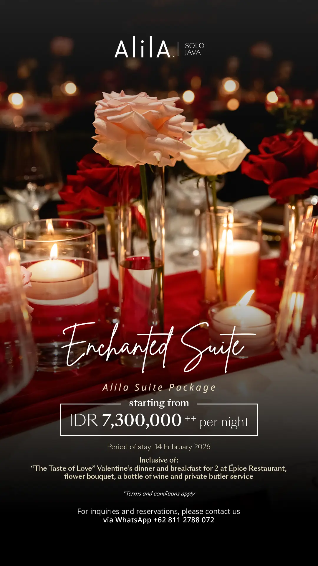 Bagi pasangan yang ingin merayakan Valentine dengan cara yang lebih eksklusif, Alila Solo menawarkan paket menginap “Enchanted Suite.” Berlaku pada 14 Februari 2026, paket ini dapat dinikmati mulai dari IDR 7.300.000++ per malam dan sudah termasuk akomodasi menginap di kamar kategori Alila Suite, makan malam romantic yang disiapkan di dalam kamar suite, satu buket rangkaian bunga, satu botol wine, serta layanan private butler yaitu asisten pribadi yang dapat memberikan bantuan dan layanan untuk pengalaman Valentine yang mewah. Paket menginap ini juga sudah termasuk sarapan untuk 2 orang dewasa di Épice Restaurant. Paket ini dirancang untuk menghadirkan keselarasan antara hidangan, suasana, dan pelayanan personal yang istimewa, yang diharapkan dapat menjadikan pengalaman yang tak terlupakan.