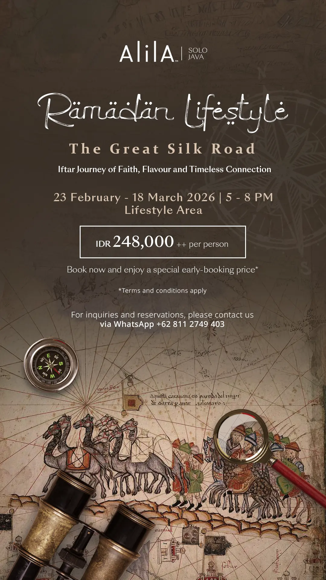 Menjelang Ramadan, Alila Solo kembali menyajikan rangkaian “Ramadan Lifestyle” bertema “The Great Silk Road,” yang dimulai pada 23 Februari hingga 18 Maret 2026 di Lifestyle Area. Dengan harga IDR 248.000++ per orang, para tamu dapat menikmati perjalanan kuliner yang terinspirasi dari Jalur Sutra, menghadirkan cita rasa autentik dari berbagai negeri.