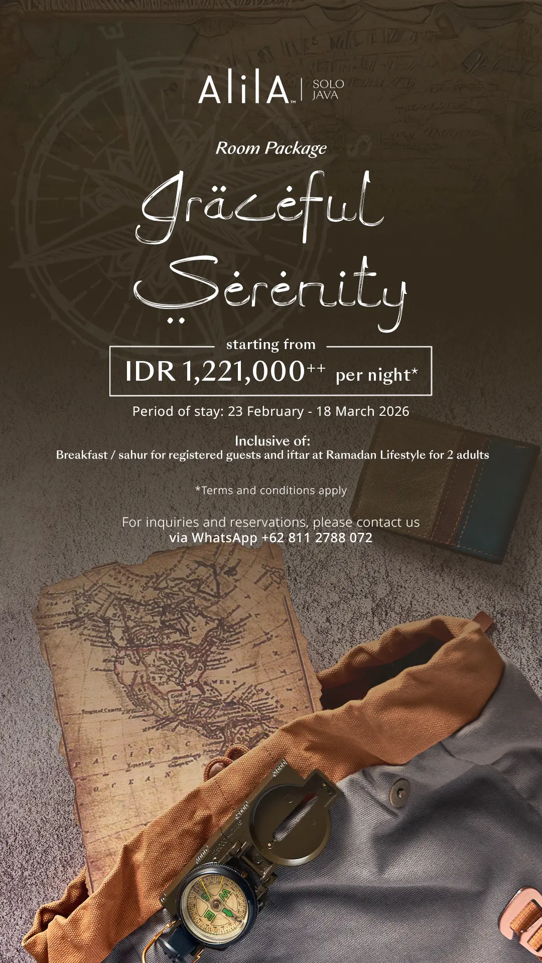 Untuk melengkapi pengalaman Ramadan, Alila Solo juga menawarkan paket kamar “Graceful Serenity” yang berlaku sepanjang periode yang sama, mulai 23 Februari hingga 18 Maret 2026. Dengan harga mulai dari IDR 1.221.000++ per malam, paket ini mencakup sahur (atau sarapan) serta berbuka puasa di Lifestyle Area untuk dua orang.
