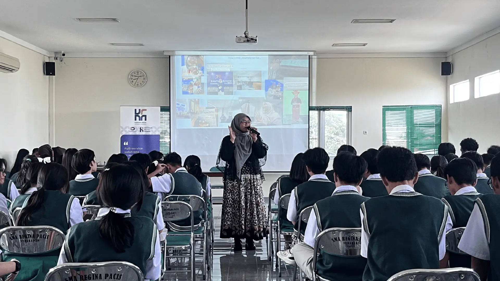 Surakarta, 11 Desember 2025 (Karavan Media) – Karavan Media Network & Research sukses menggelar KMNR’s School Invasion di SMA Regina Pacis Surakarta berkolaborasi dengan Speaktacular.id. Kegiatan yang berfokus pada peningkatan kemampuan English Public Speaking ini dilaksanakan pada Rabu, 10 Desember 2025 di Ursula Hall SMA Regina Pacis dan diikuti oleh siswa dari tiga kelas: XI-H, XI-I, dan XI-J.